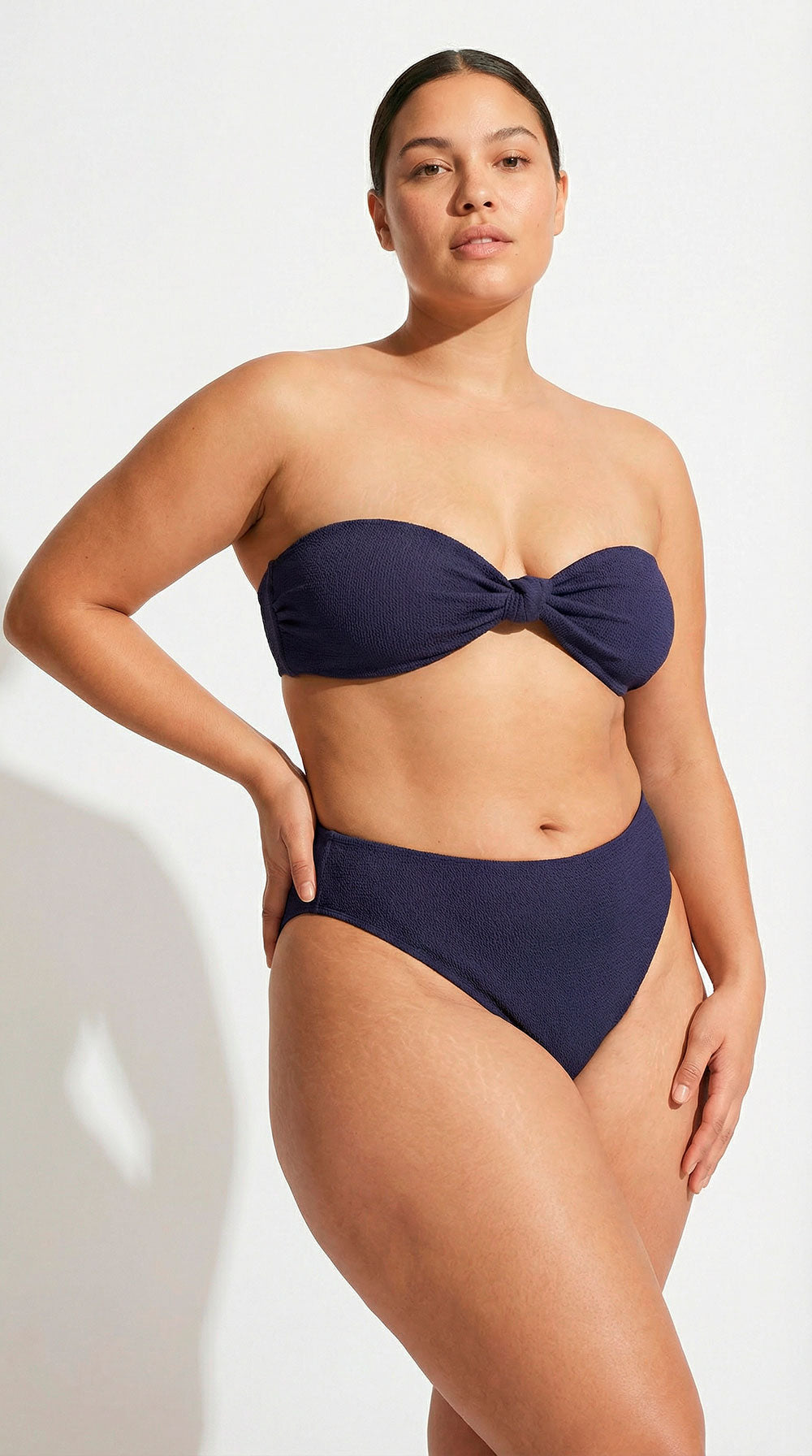 Notre bandeau de bikini Sacha bleu marine est confectionné en polyester recyclé doux, avec une jolie texture et un élégant nœud au centre. Grâce à ses bretelles amovibles, il offre une coupe parfaite, que vous soyez à la plage ou en train de nager. Complétez votre ensemble avec le bas de bikini Sacha assorti ou le tanga Sacha pour un look de plage irrésistible.