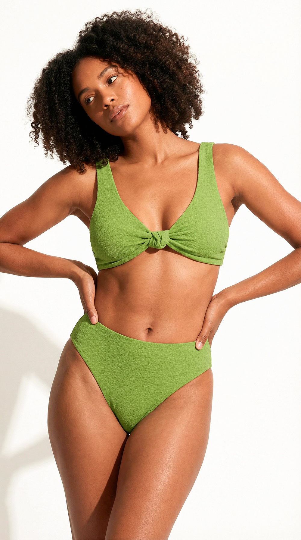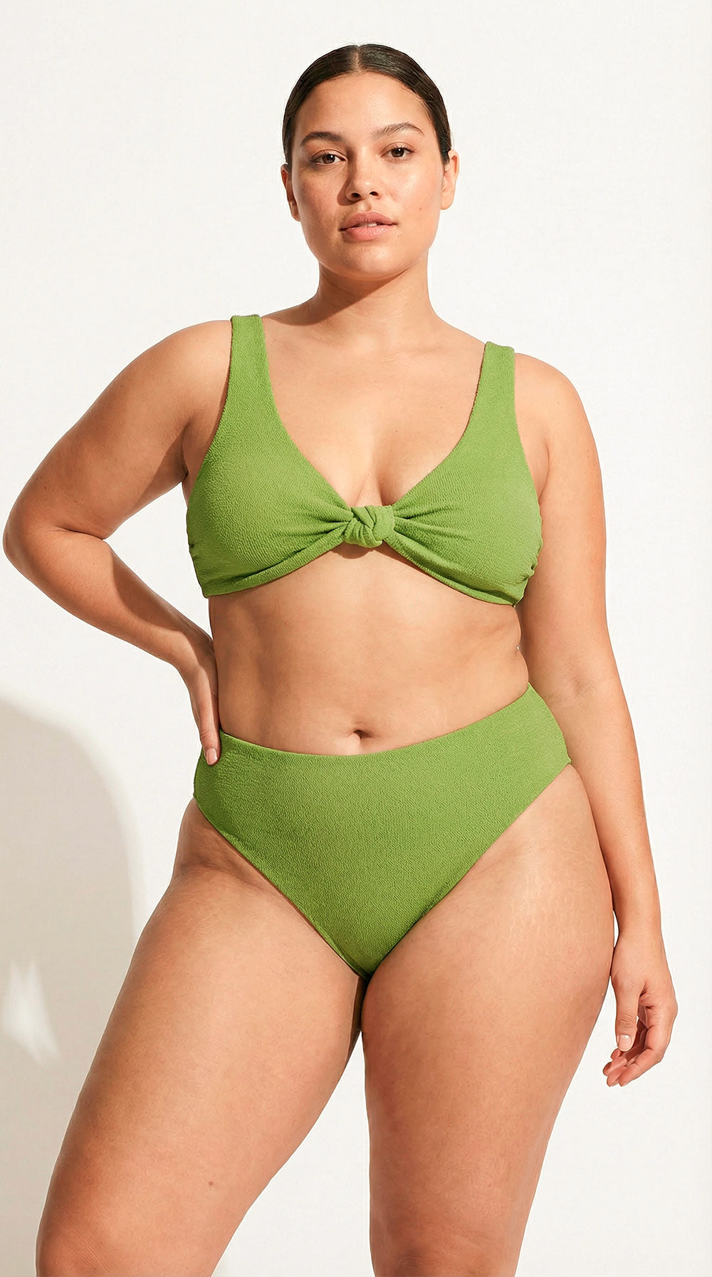 Our Sacha bikini bra in green is crafted from soft, recycled polyester with a beautiful textured finish. Designed with a flattering knot detail at the front and wide shoulder straps for extra support, it’s as comfortable as it is stylish. Complete the set with our matching Sacha bikini briefs or Sacha bikini tanga for a beautiful beach look.